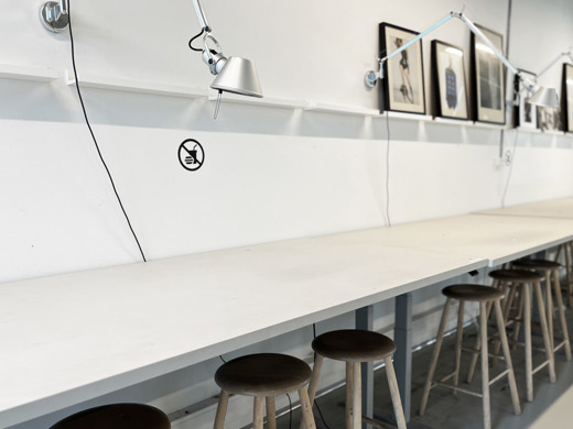 Hvis du har brug for mere plads til eksempelvis mønsterkonstruktion, udklipning af stof m.m. er der ligeledes placeret et væld af tilskæringsborde i Open Learning, samt i undervisningslokalerne herom.